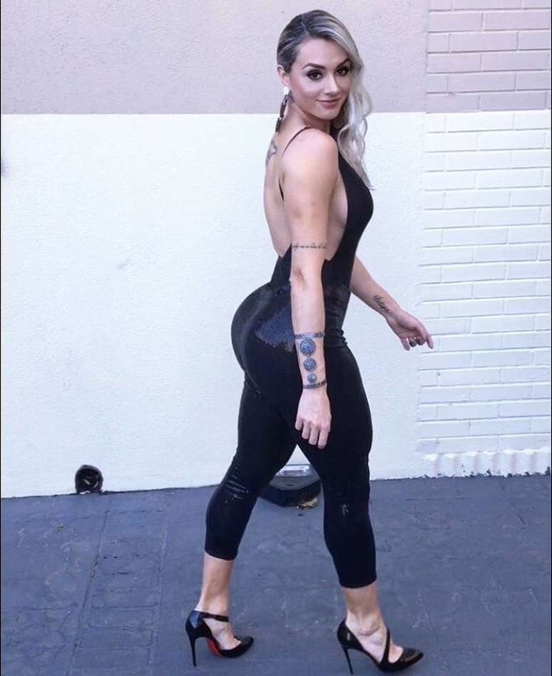 Ex-panicat postou foto usando um macacão preto colado e desagradou uma seguidora; “chora que hidrata”, escreveu Juju
