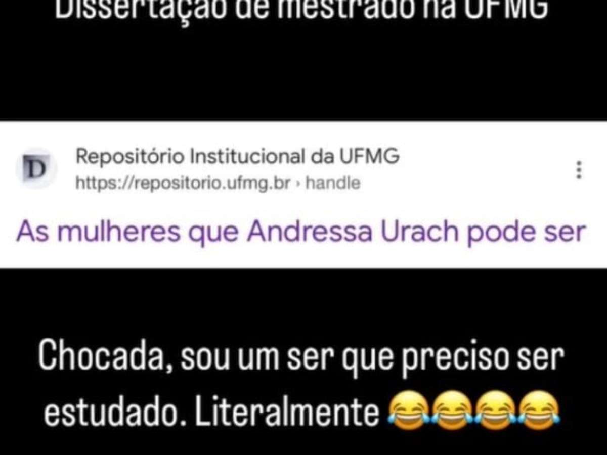 Andressa Urach ficou em estado de choque ao fazer uma descoberta na madrugada desta sexta-feira, 10/11. Ex-participante de 'A Fazenda' e criadora de conteúdo adulto, a famosa virou tema de uma dissertação de mestrado da UFMG (Universidade Federal de Minas Gerais).