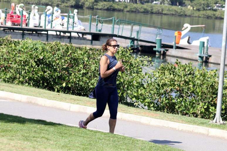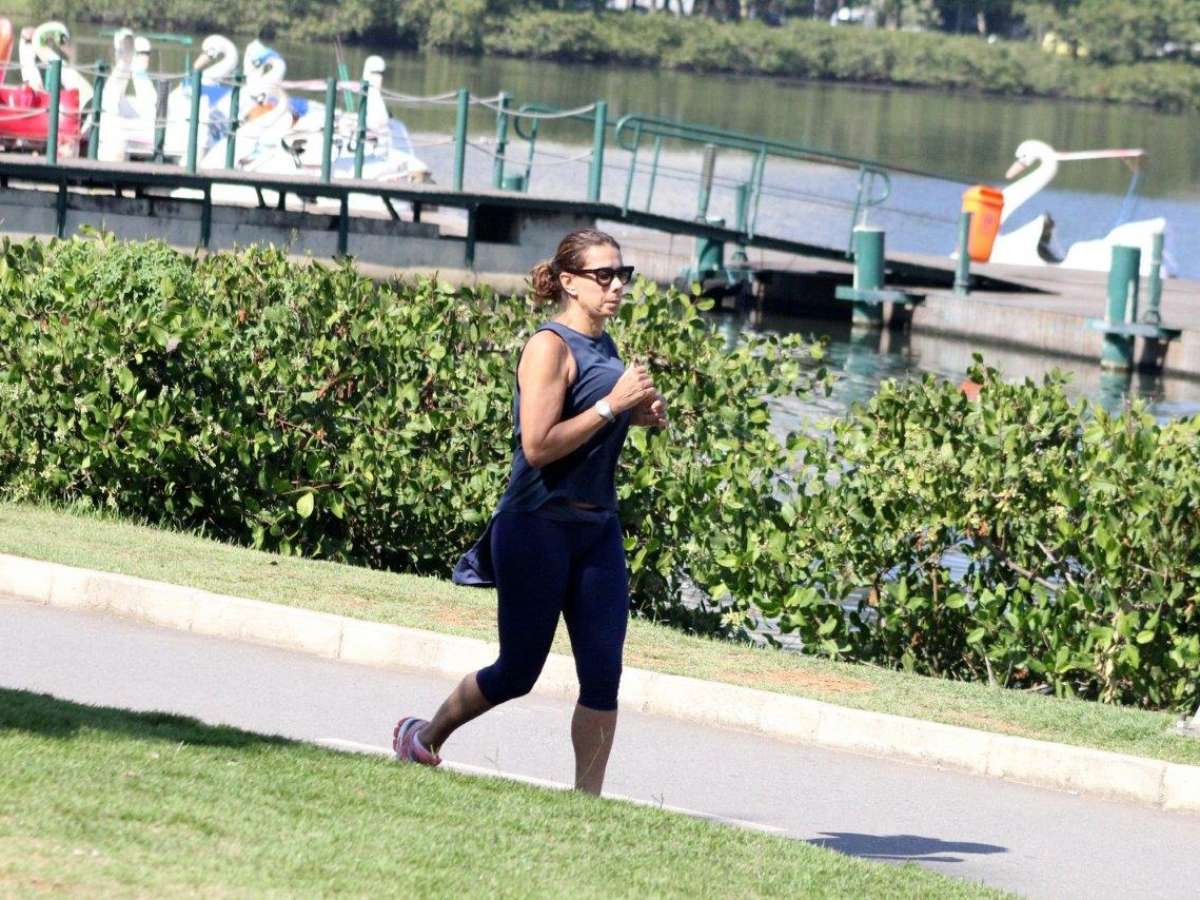 Aos 62 anos, a atriz Ângela Vieira mostrou disposição para correr debaixo de sol na Lagoa Rodrigo de Freitas, no Rio de Janeiro, nesta quinta-feira (15)