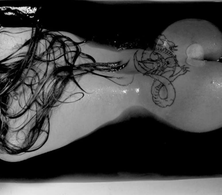 A artista que também tem várias tatuagens espalhadas pelo corpo, não abre mão de arte mais ousada. No cóccix, ela eternizou um dragão enorme.