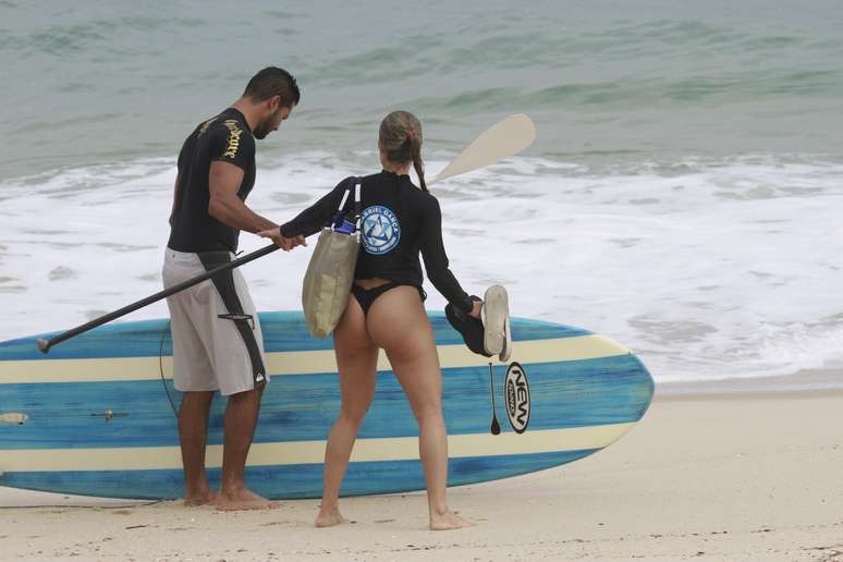 Aryane Steinpkof foi fotografa nesta segunda-feira (23) aos beijos com Beto Malfacini. Os dois eliminados da sexta edição de A Fazenda curtiram a praia da Macumba