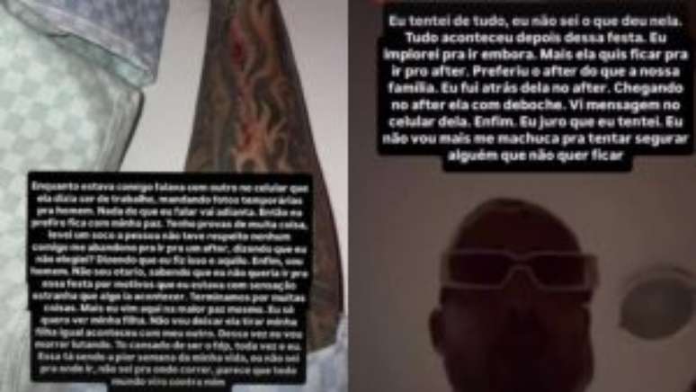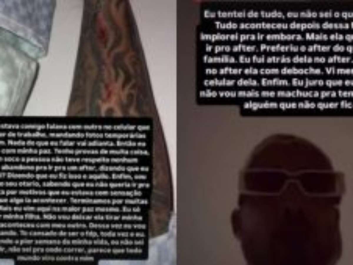 Em seguida, ele ainda relatou o que aconteceu na noite anterior. "Me abandonou para ir para um after dizendo que eu não elogiei. Dizendo que fiz isso e aquilo. Enfim, sou homem. Não sou otário. Não queria ficar na festa por motivos que eu estava com sensação estranha de que algo iria acontecer. Terminamos por muitas coisas".