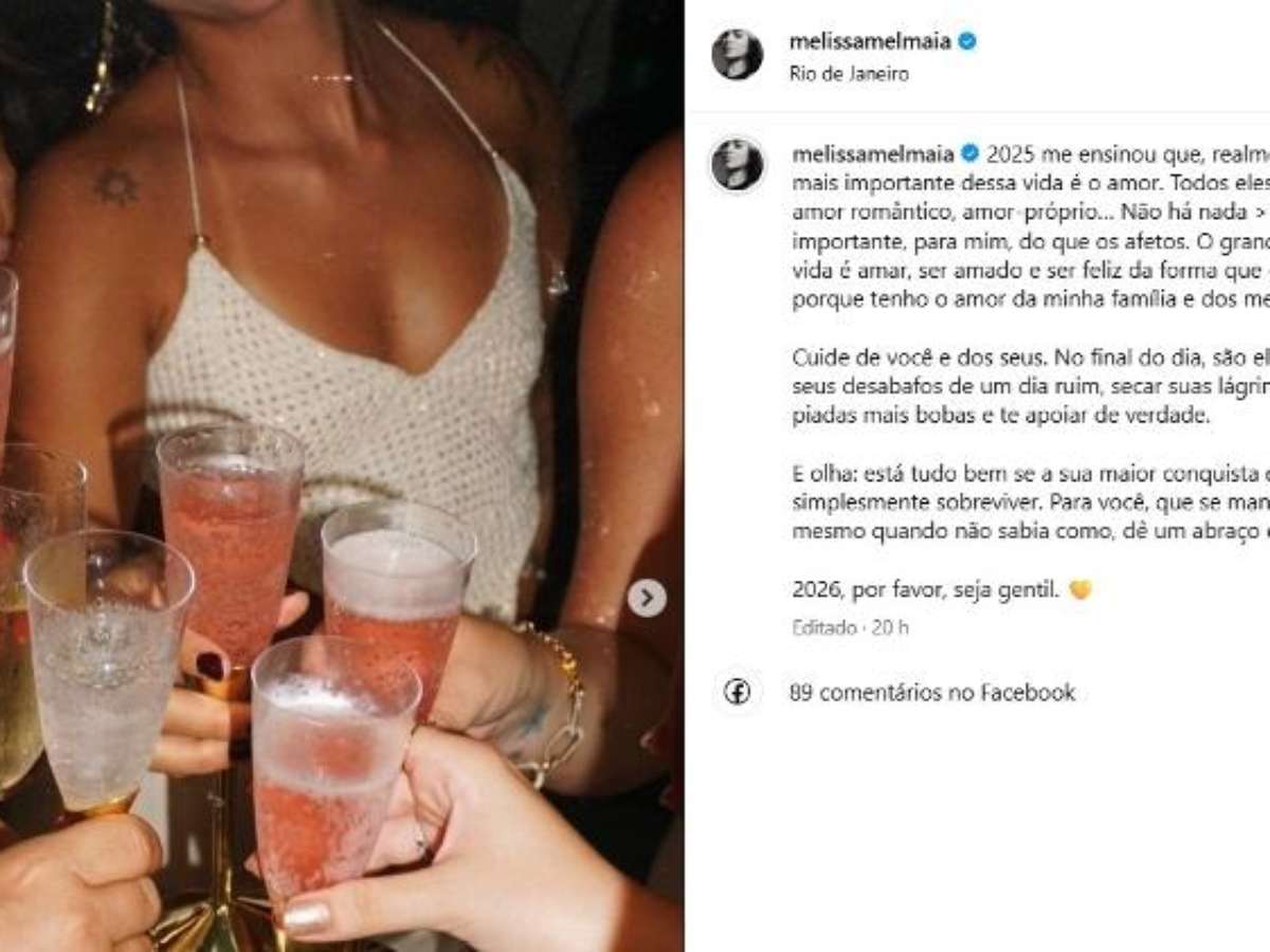 Ao olhar para trás, Mel também fez um apelo por mais gentileza consigo mesma e com os outros em 2026. Ela destacou que nem sempre as conquistas precisam ser grandiosas para terem valor. "E olha: está tudo bem se a sua maior conquista em 2025 foi simplesmente sobreviver", escreveu. Em seguida, completou: "Para você, que se manteve de pé mesmo quando não sabia como, dê um abraço em si mesmo", reforçando a importância do autocuidado.