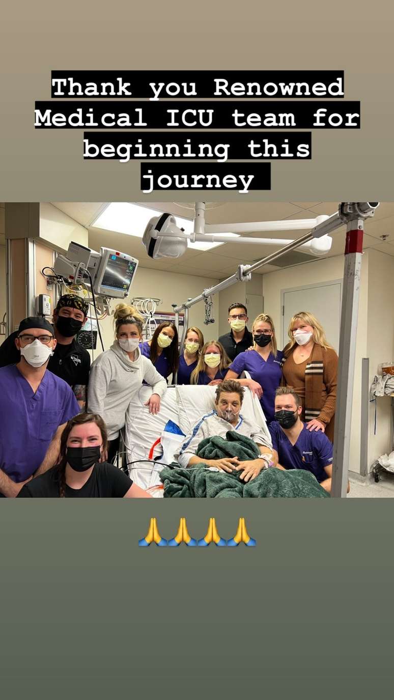 "Obrigado à renomada equipe da UTI por começar essa jornada", escreveu o ator, ao compartilhar uma foto no stories do Instagram, cercado pelos profissionais que fizeram duas cirurgias em seu corpo.