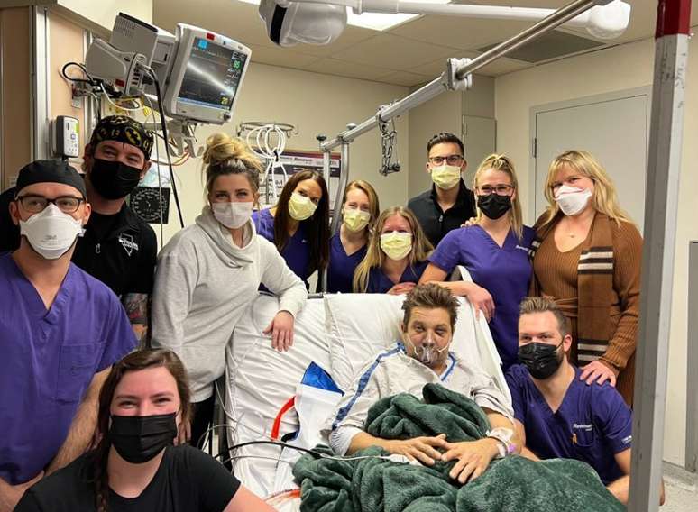 O ator Jeremy Renner, intérprete do Gavião Arqueiro nos filmes da Marvel, completou 52 anos neste sábado (7/1) e comemorou com a equipe responsável por seu tratamento no hospital, em que está internado desde um acidente com uma máquina de remoção de neve em 1° de janeiro, em Reno, nos Estados Unidos.