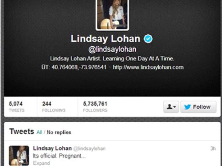 Um dia após deixar o Brasil, a atriz e cantora americana Lindsay Lohan causou furor no Twitter ao declarar que está grávida, nas primeiras horas desta terça-feira (horário de Brasília). A postagem rapidamente foi reproduzida por mais de 10 mil usuários e chegou aos trending topics mundiais - fãs, porém, acreditam que a notícia se trate apenas de uma piada de primeiro de abril, segundo informações do The Sun.