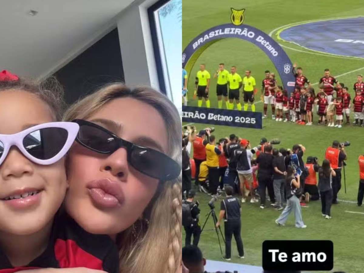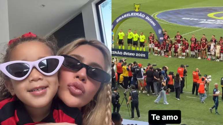 A influenciadora compartilhou em seu perfil do Instagram seus preparos para a partida, com ela e a pequena se arrumando para sair. Após um clique das duas já prontas posando juntas, ela publicou momentos no estádio, aproveitando para se declarar ao namorado. "Te amo", escreveu ela ao filmar Léo antes do jogo iniciar.