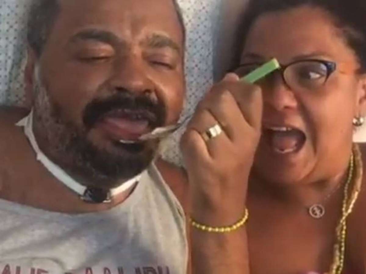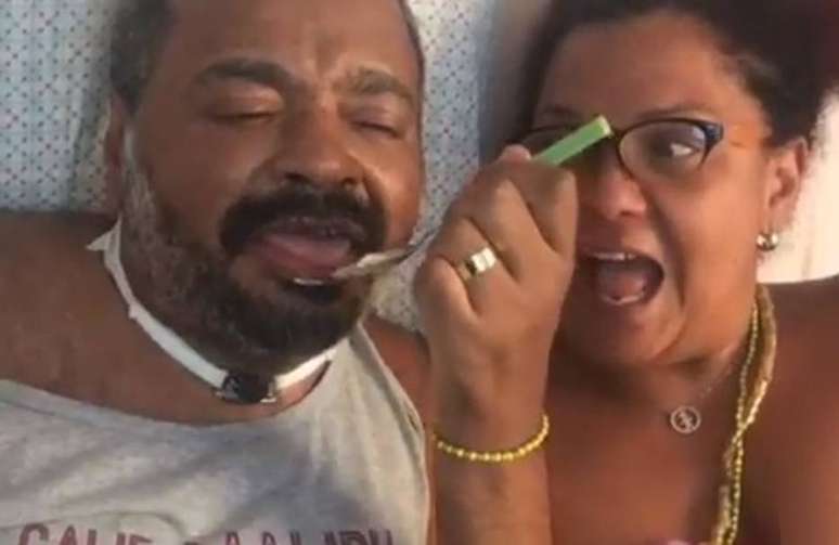 Arlindo Cruz se alimenta sozinho ao lado de sua esposa.