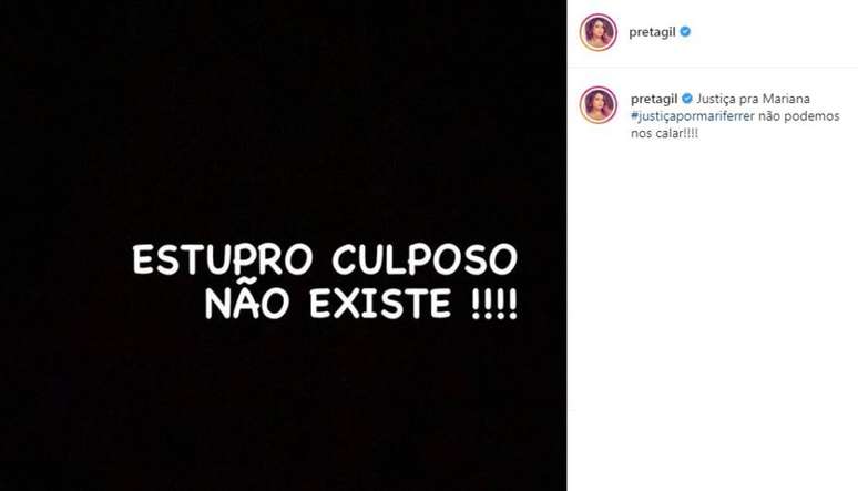 "Estupro culposo não existe. Um completo absurdo termos que discutir essa questão. É muito difícil ser mulher num País onde se inventa sentença para acobertar estuprador", postou Camila Pitanga.