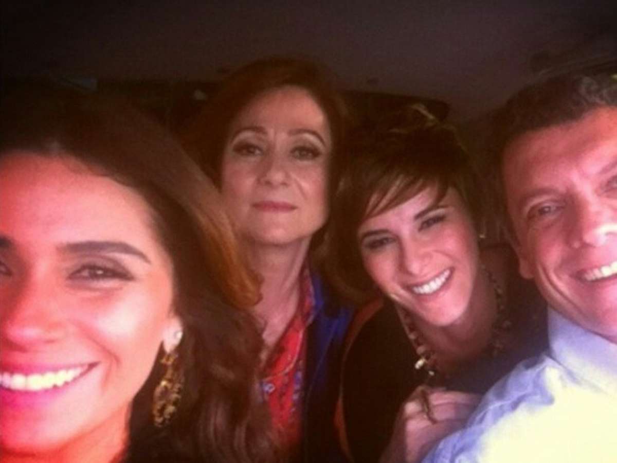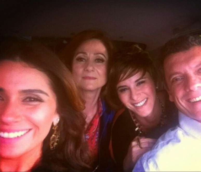 Em uma delas, parte do elenco se espremeu para caber na imagem. Giovanna Antonelli (Heloisa), Zezé Polessa (Berna) e Marcelo Airoldi (Barros) posaram juntos de Dani dentro de um carro no intervalo das gravações.