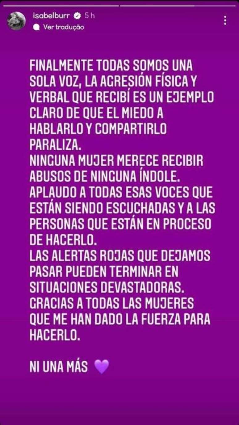 "A agressão física e verbal que eu recebi é um exemplo claro de que o medo de falar e de compartilhar paralisa. Nenhuma mulher merece receber abusos de nenhuma índole. Os alertas vermelhos que deixamos passar podem terminar em situações devastadores", declarou a atriz.
