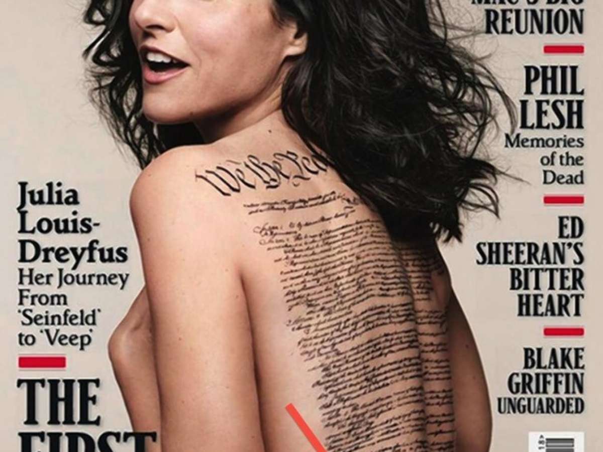 Eterna Elaine Benes da série de TV Seinfeld, a atriz Julia Louis-Dreyfus fez um ensaio sensual para a capa da revista Rolling Stone dos Estados Unidos. Na foto, ela aparece nua e com uma tatuagem temporária com a Constituição dos Estados Unidos. A assinatura ao final do texto, no entanto, é de John Hancock, responsável pela Declaração de Independência do país, e não da Constituição.