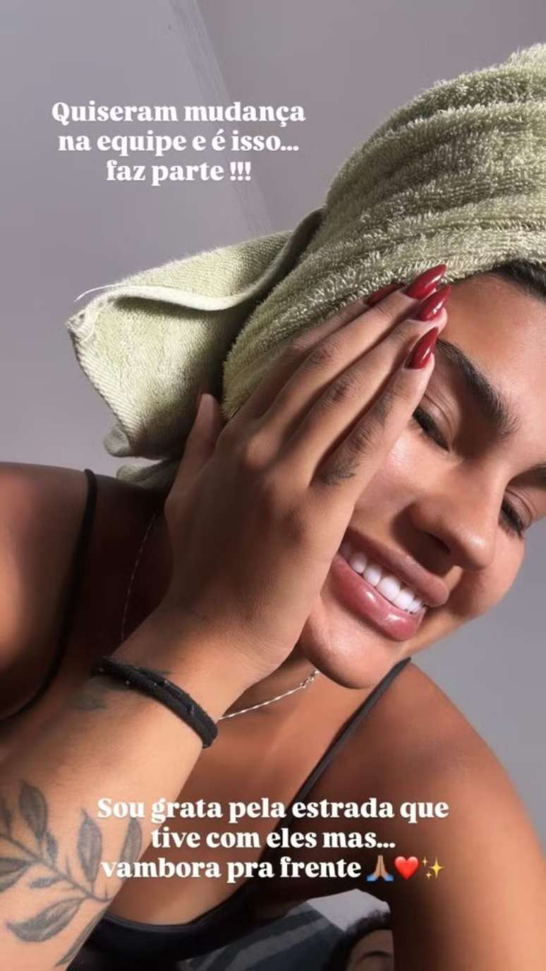 Ela ainda destacou que a decisão partiu da equipe do cantor, que optou por mudanças no time. "Quiseram mudança na equipe e é isso... faz parte! Sou grata pela estrada que tive com eles, mas vambora para frente", completou a profissional.