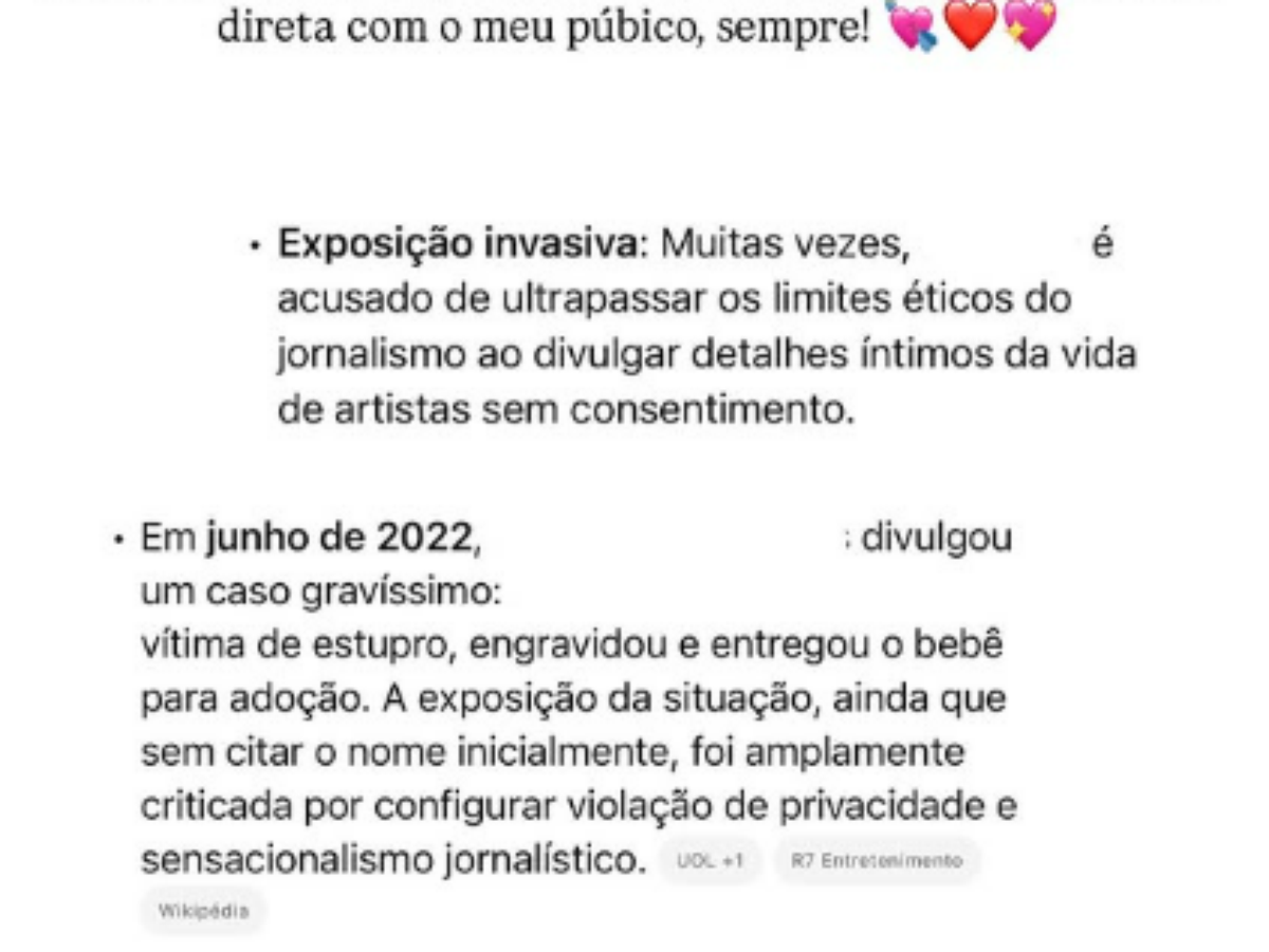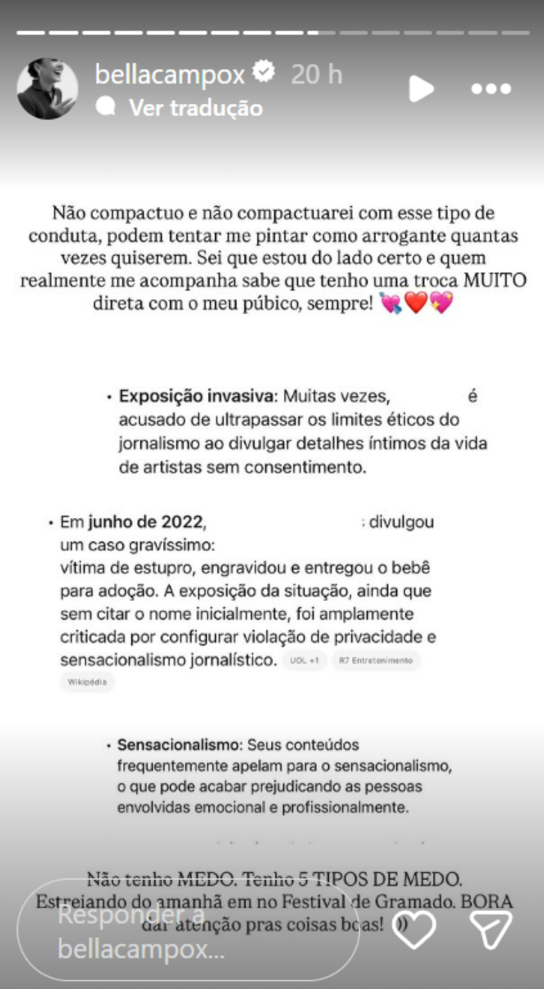Bella reforçou a crítica ao expor conceitos de "exposição invasiva" e "sensacionalismo", associando-os ao caso de Klara Castanho, cuja privacidade foi violada em 2022 por revelações jornalísticas sem consentimento.