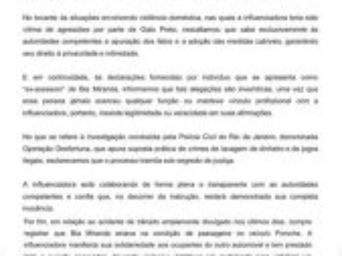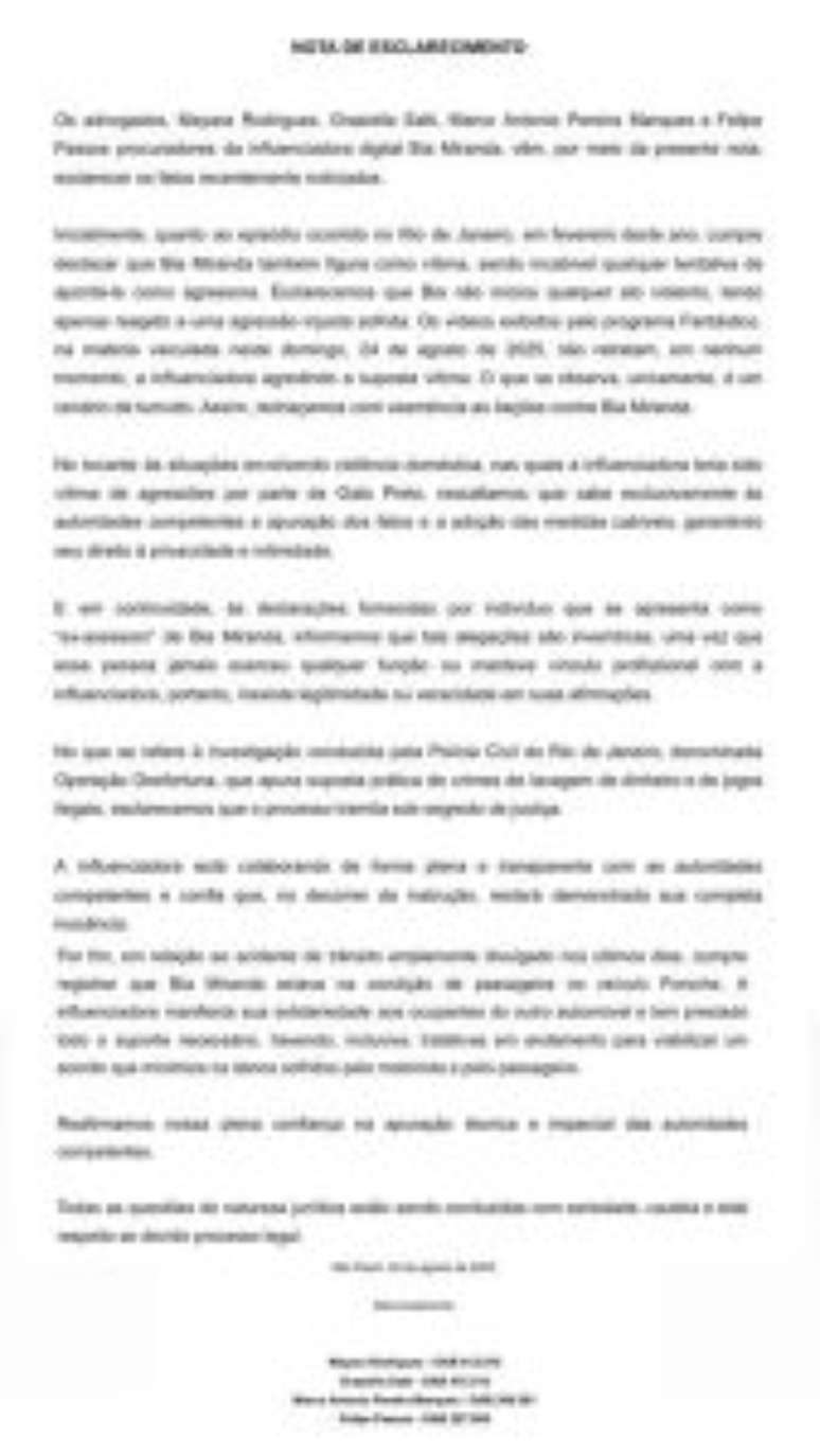 "Inicialmente, quanto ao episódio ocorrido no Rio de Janeiro, em fevereiro deste ano, cumpre destacar que Bia Miranda também figura como vítima, sendo incabível qualquer tentativa de apontá-la como agressora. Esclarecemos que Bia não iniciou qualquer ato violento, tendo apenas reagido a uma agressão injusta sofrida. Os vídeos exibidos pelo programa Fantástico, na matéria veiculada neste domingo, 24 de agosto de 2025, não retratam, em nenhum momento, a influenciadora agredindo a suposta vítima. O que se observa, unicamente, é um cenário de tumulto. Assim, rechaçamos com veemência as ilações contra Bia Miranda", diz o texto.