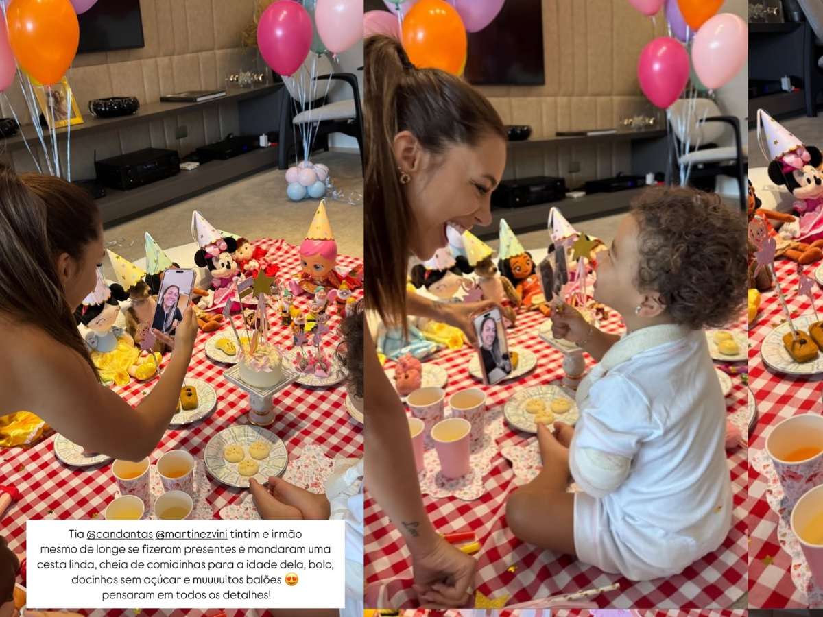 "Hoje o dia começou assim", escreveu Bruna ao mostrar Mavie caminhando pelo chão coberto de confetes até encontrar sua surpresa de aniversário. A cesta, enviada por Davi Lucca e sua mãe, Carol Dantas, acompanhada do padrasto Vinícius Martinez e do irmão caçula Valentim, estava repleta de comidinhas saudáveis, bolo, docinhos sem açúcar e muitos balões coloridos. "Eles pensaram em todos os detalhes!", elogiou a mãe coruja.