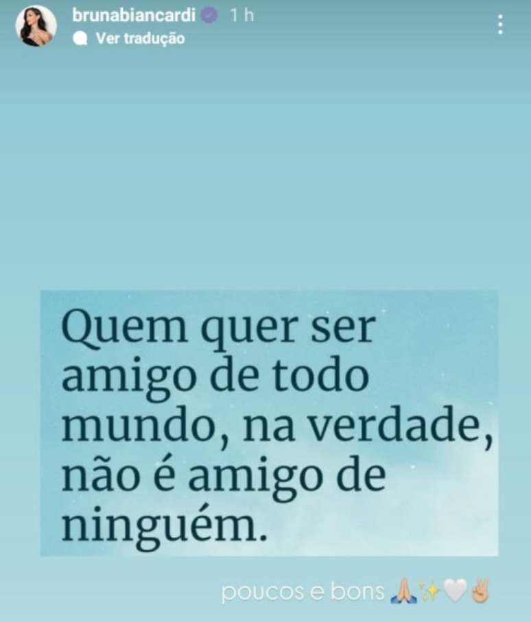 "Quem quer ser amigo de todo mundo, na verdade, não é amigo de ninguém", diz o post, compartilhado pela famosa. Biancardi ainda acrescentou: "Poucos e bons", escreveu.