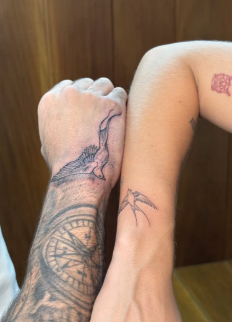 Bruna Griphao e Yam Vieira escolheram tatuar uma andorinha, símbolo frequentemente associado à liberdade, esperança e novos começos.