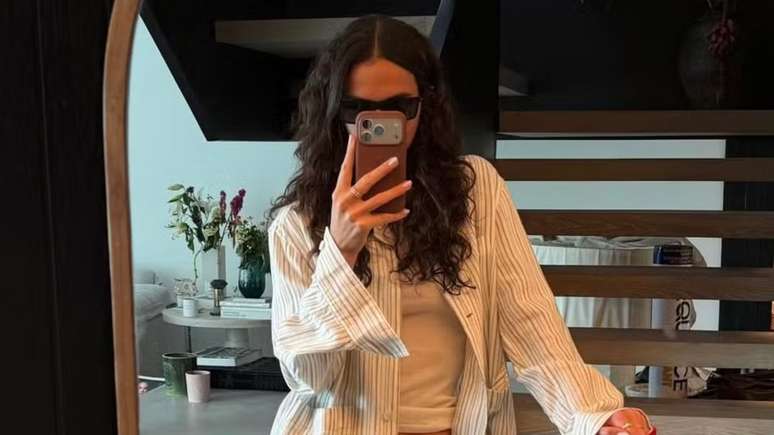 Em uma selfie publicada nos Stories do Instagram, Bruna mostrou que priorizou a praticidade para a viagem. O look escolhido foi uma composição despojada de camisa listrada, baby look branca e uma calça larga na mesma estampa. Para arrematar o visual no clima do verão baiano, a atriz apostou em óculos de sol e chinelos brancos.