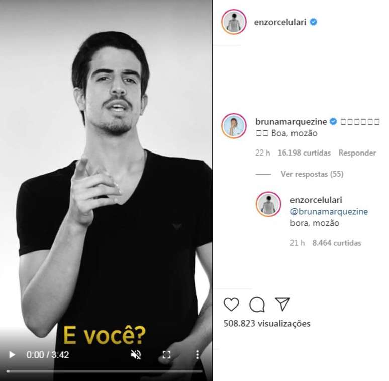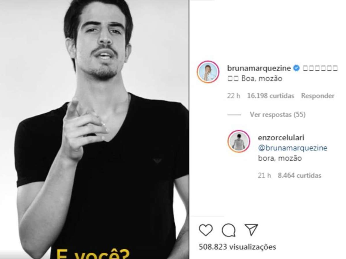 Em um vídeo publicado no Instagram de Enzo Celulari, Bruna Marquezine comentou "Boa, mozão", ao lado de emojis de aplausos. Ele respondeu em seguida, no mesmo tom: "Bora, mozão".