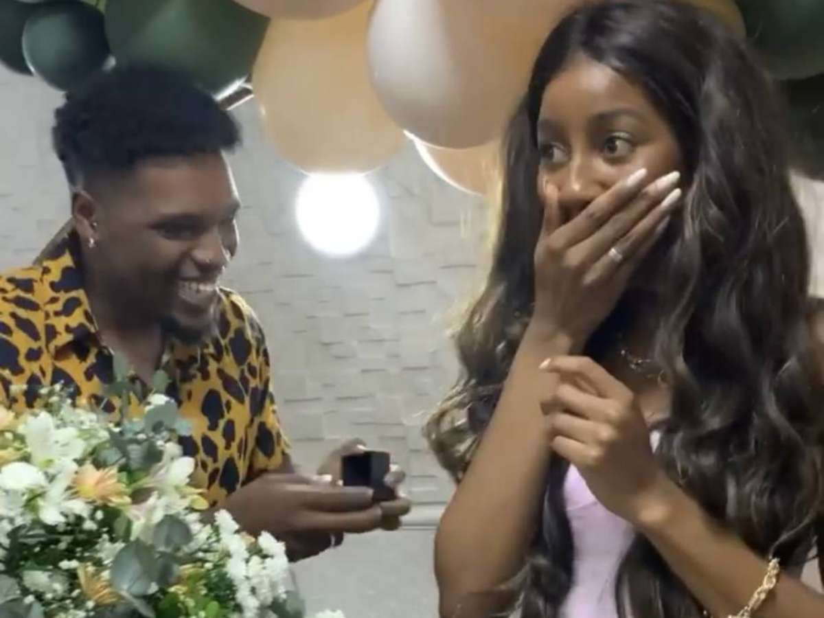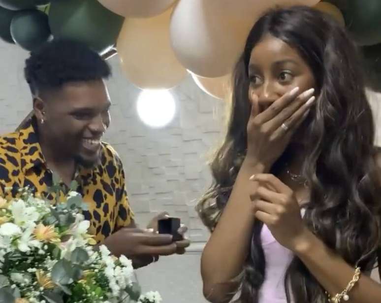 Em meio a balões verdes e amarelos e os docinhos da mesa, o namorado, Mateus Ricardo, tirou uma caixinha de anel do bolso e foi se ajoelhando no chão. "Quero te pedir em casamento", disse.