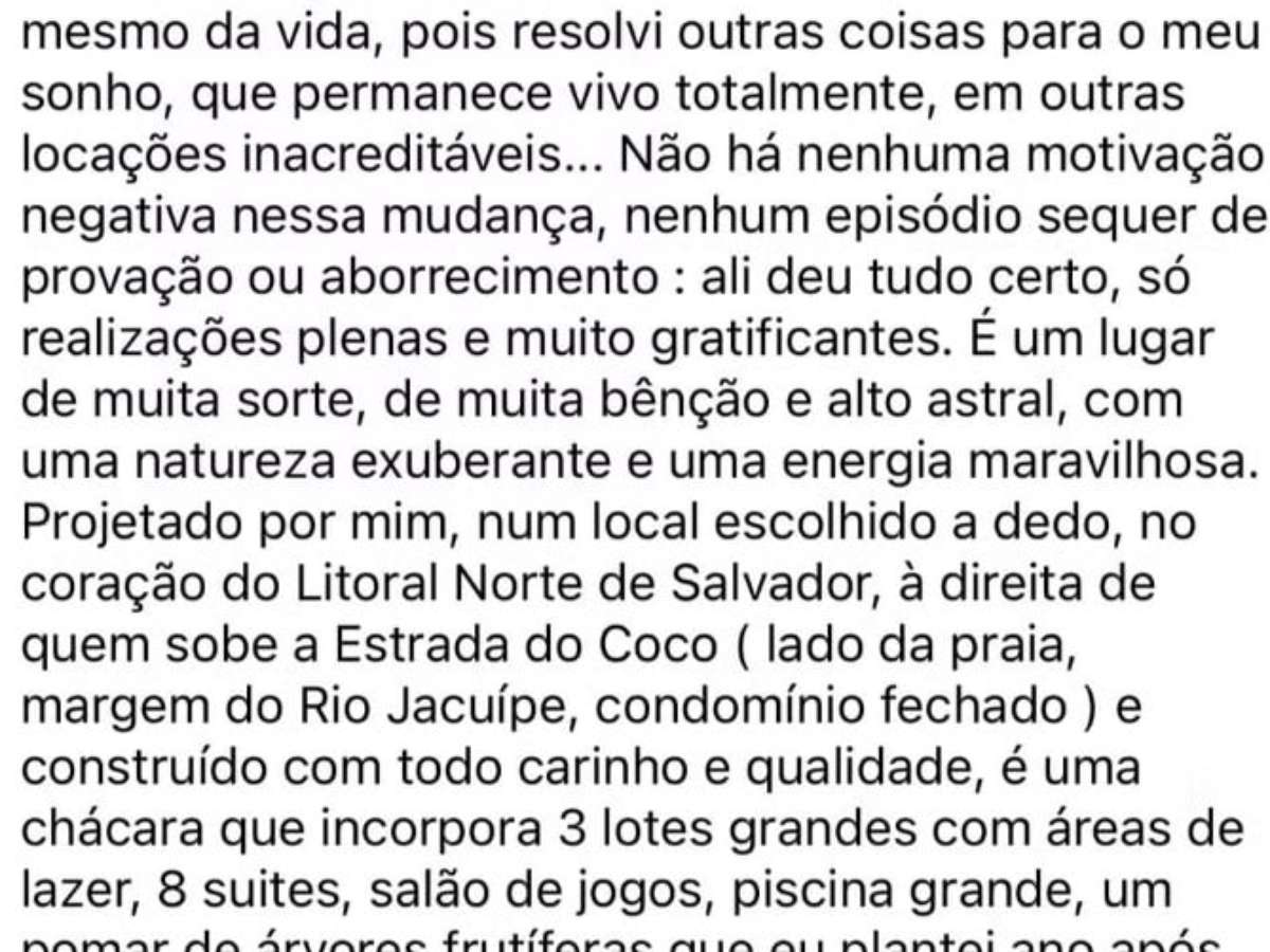 "A razão da venda (da chácara) é a dinâmica mesmo da vida, pois resolvi outras coisas para o meu sonho, que permanece vivo totalmente, em outras locações inacreditáveis", escreveu Guilherme.