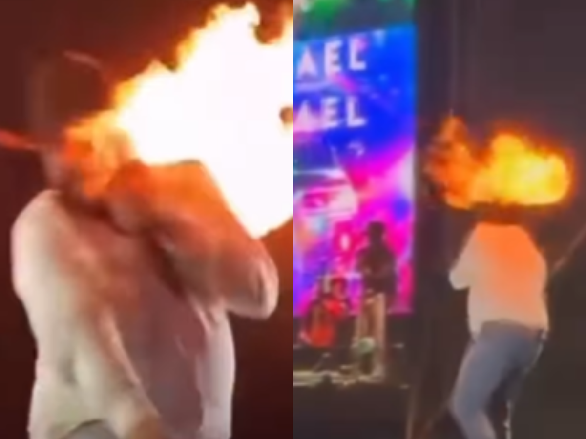 Segundo ele, o produto usado no efeito grudou na pele e continuou queimando por cerca de cinco segundos. "Ficou uns 5s, mais ou menos, pegando fogo e foi um desespero. Tem isopropílico, sei lá, e grudou, virou um óleo, sei lá, um trem na cara e não saia. Ficou pegando fogo. Apagou o fogo ali na hora", contou.