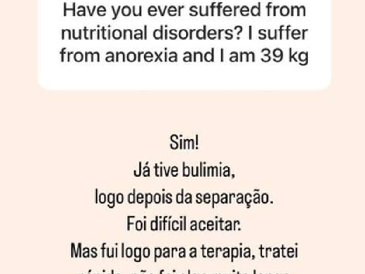 "Já tive bulimia logo depois da separação. Foi difícil aceitar. Mas logo fui para terapia, tratei rápido e não foi algo muito longo (cerca de 3, 6 meses). Percebi a ligação do emocional com alimentação de forma intensa", escreveu.