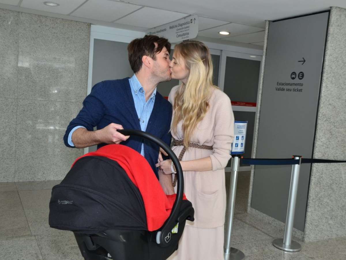Carol Trentini deixa maternidade em SP com Bento, seu 1º filho