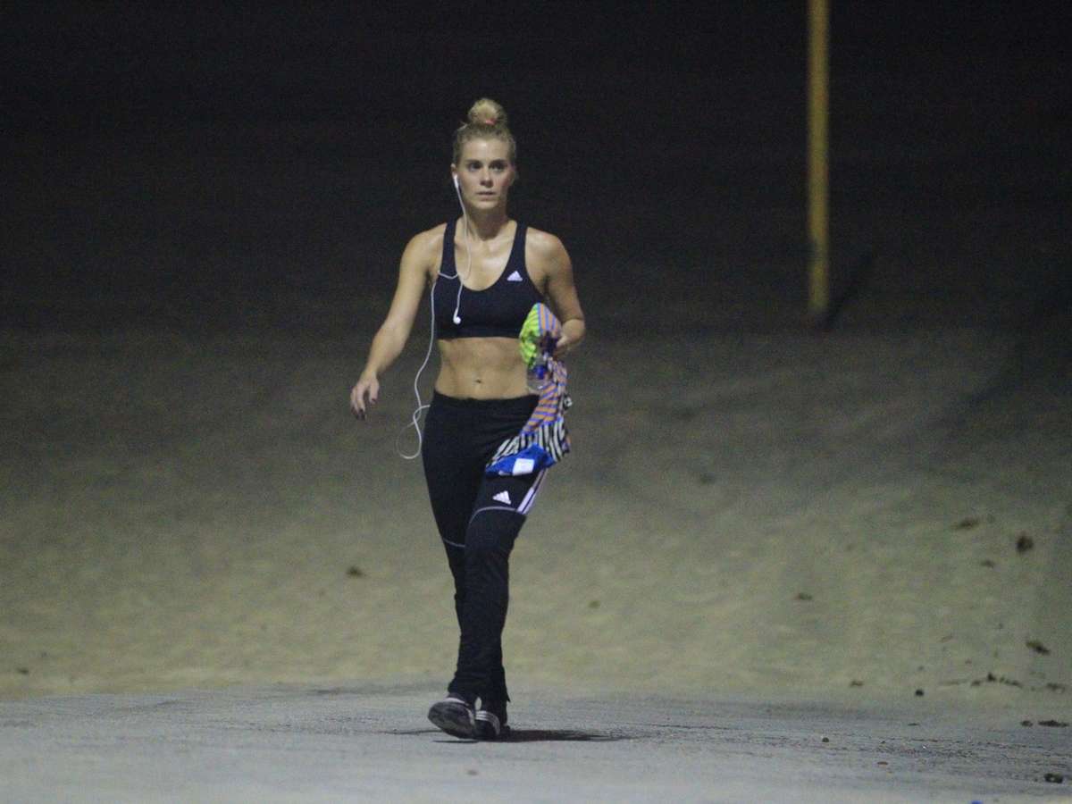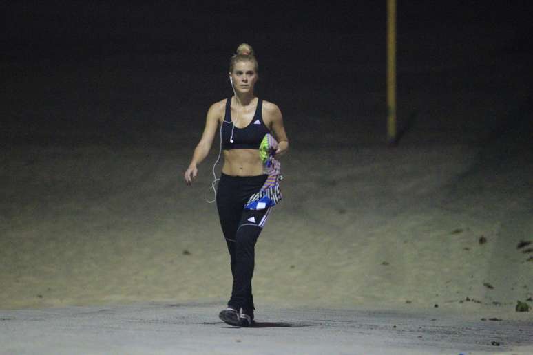 Carolina Dieckmann não tem hora para malhar. Vestindo top e calça de ginástica, a atriz se exercitou à noite na praia de São Conrado, no Rio de Janeiro, nesta segunda-feira (7). Ao se deparar com o fotógrafo, Dieckmann acenou com simpatia
