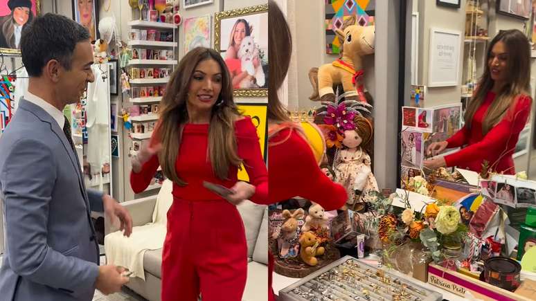 "Tem uma poeta aqui? Olha esse camarim! Fazia tempo que eu estava para visitar esse camarim… Que coisa mais linda, hein?!", iniciou o apresentador. "Está faltando parede", brincou o marido de Ticiane Pinheiro, enquanto seu assistente registrava takes do cantinho da famosa na emissora carioca.