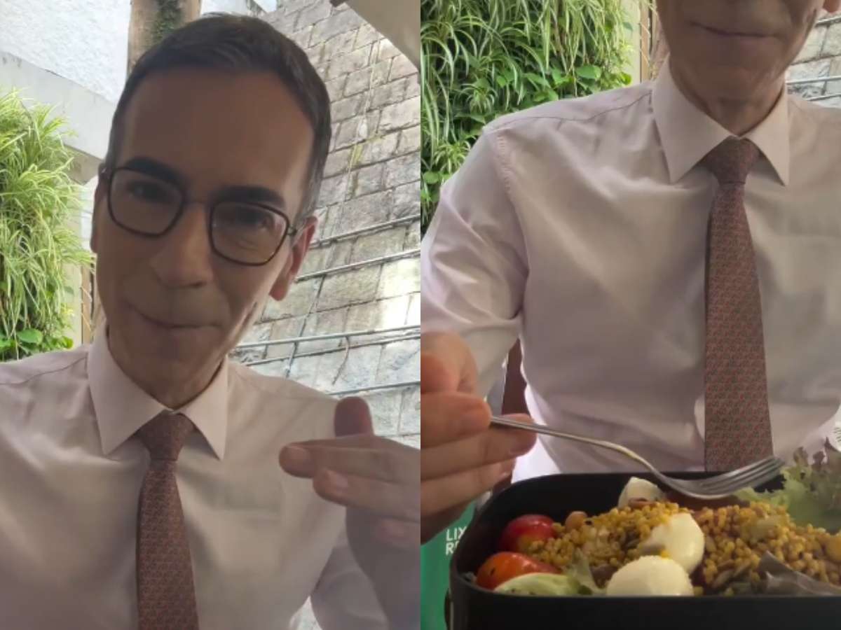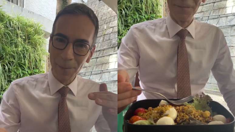 Nesta quarta-feira (26), César Tralli usou o Instagram para compartilhar um vídeo no qual aparece comendo uma marmita nos bastidores da TV Globo. "Quem disse que ela não vinha? Como é que eu ia deixar para trás esse hábito?", indagou o apresentador do Jornal Nacional.