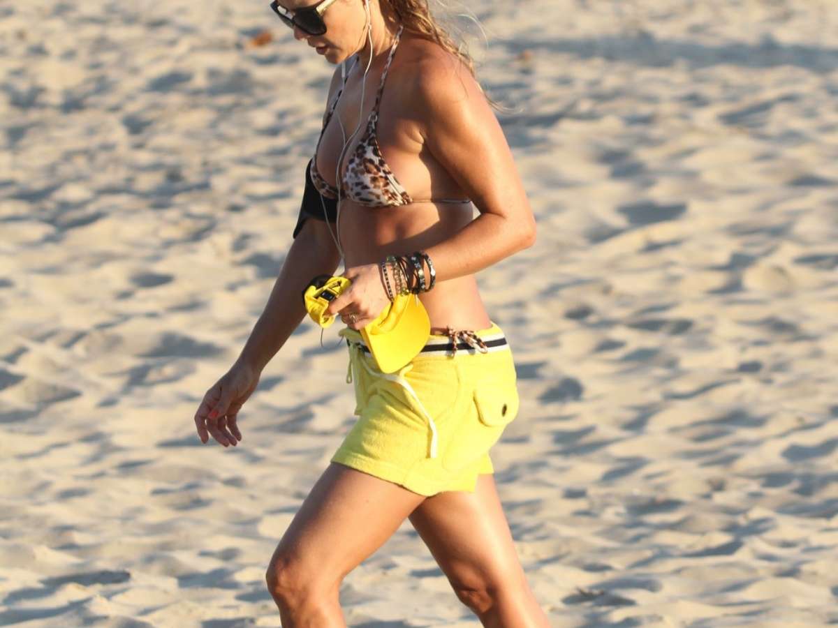 Christine Fernandes, 45 anos, aproveitou o sol desta quinta-feira (6) para correr na praia da Barra da Tijuca, no Rio de Janeiro. De shorts e biquíni de oncinha, a atriz exibiu boa forma.