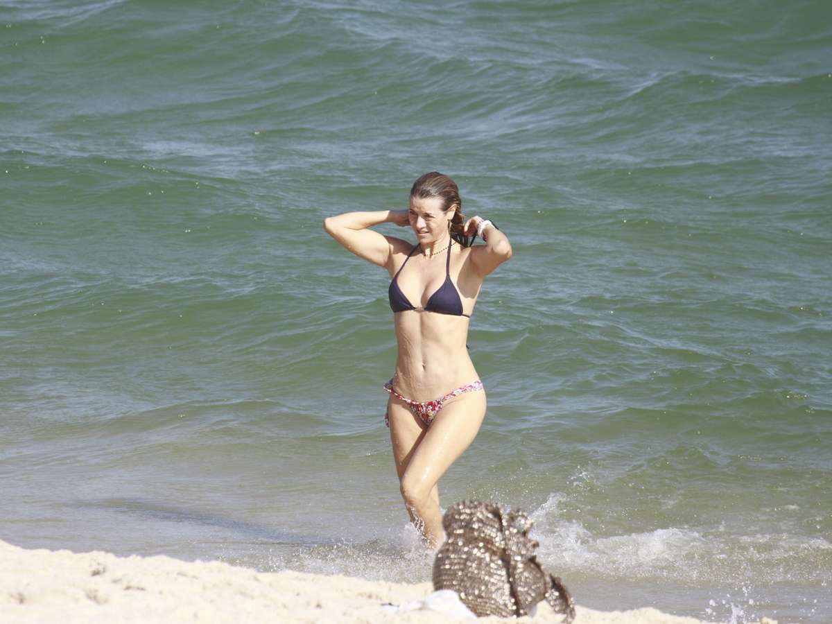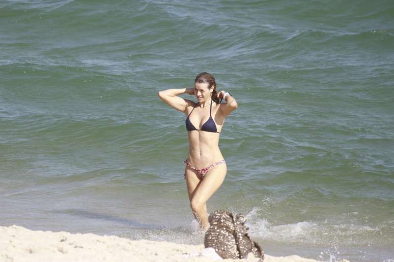 Christine Fernandes, 45 anos, aproveitou o sol desta quinta-feira (12) para curtir uma praia na Barra da Tijuca, na zona oeste do Rio de Janeiro. De biquíni, a atriz exibiu boa forma enquanto nadava e relaxava com amigas na areia