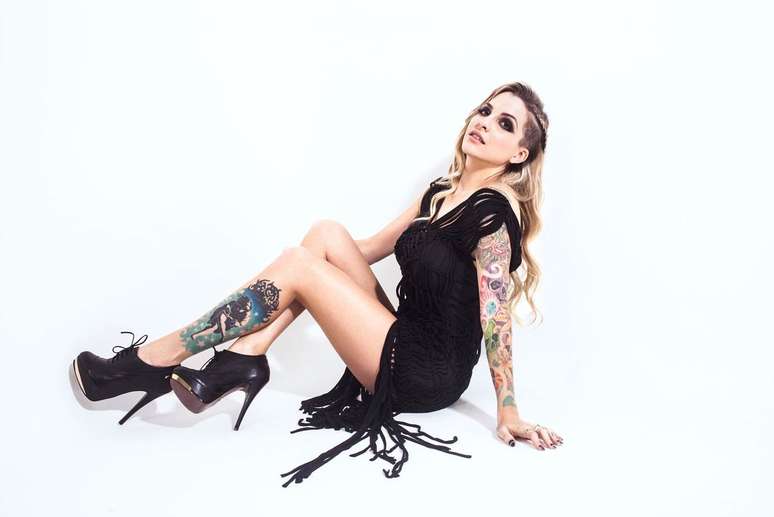 Para o ensaio, Clara posa com a jaqueta aberta e vestido preto curtinho de franjas caprichando na sensualidade.