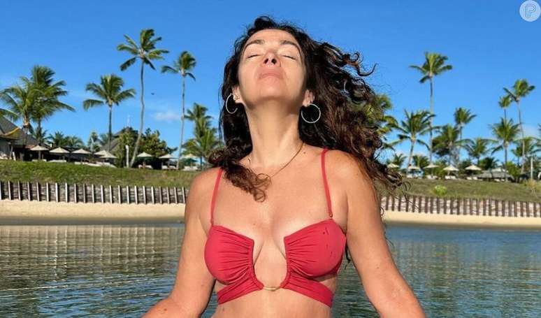 Completando 61 anos nesta terça-feira, dia 06 de fevereiro, a atriz Claudia Ohana surgiu de biquíni vermelho fio-dental na melhor comemoração possível: desfilando nas águas de Porto de Galinhas