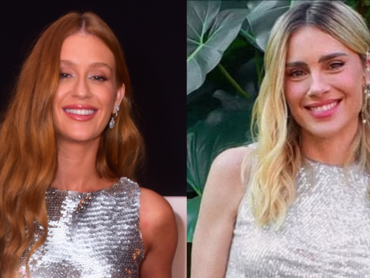 A inspiração das peças pode ter sido um look vestido pela própria Marina em 2022, durante evento de uma joalheria de luxo. Apesar das diferenças na modelagem, a atriz também apostou em um conjunto de top e saia, com um prateado bastante brilhoso e a barriga de fora.