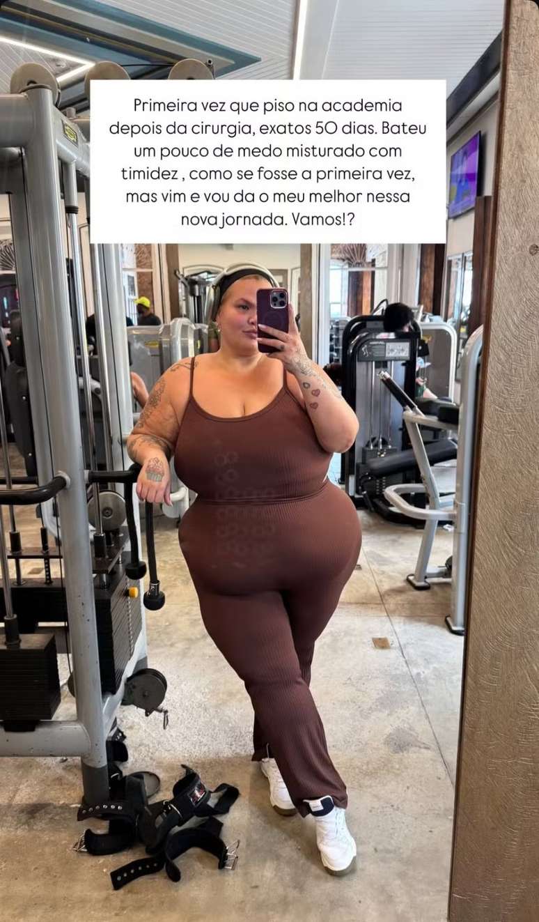 "Primeira vez que piso na academia depois da cirurgia, exatos 50 dias. Bateu um pouco de medo misturado com timidez, como se fosse a primeira vez, mas vim e vou dar o meu melhor nessa nova jornada. Vamos!?", declarou.