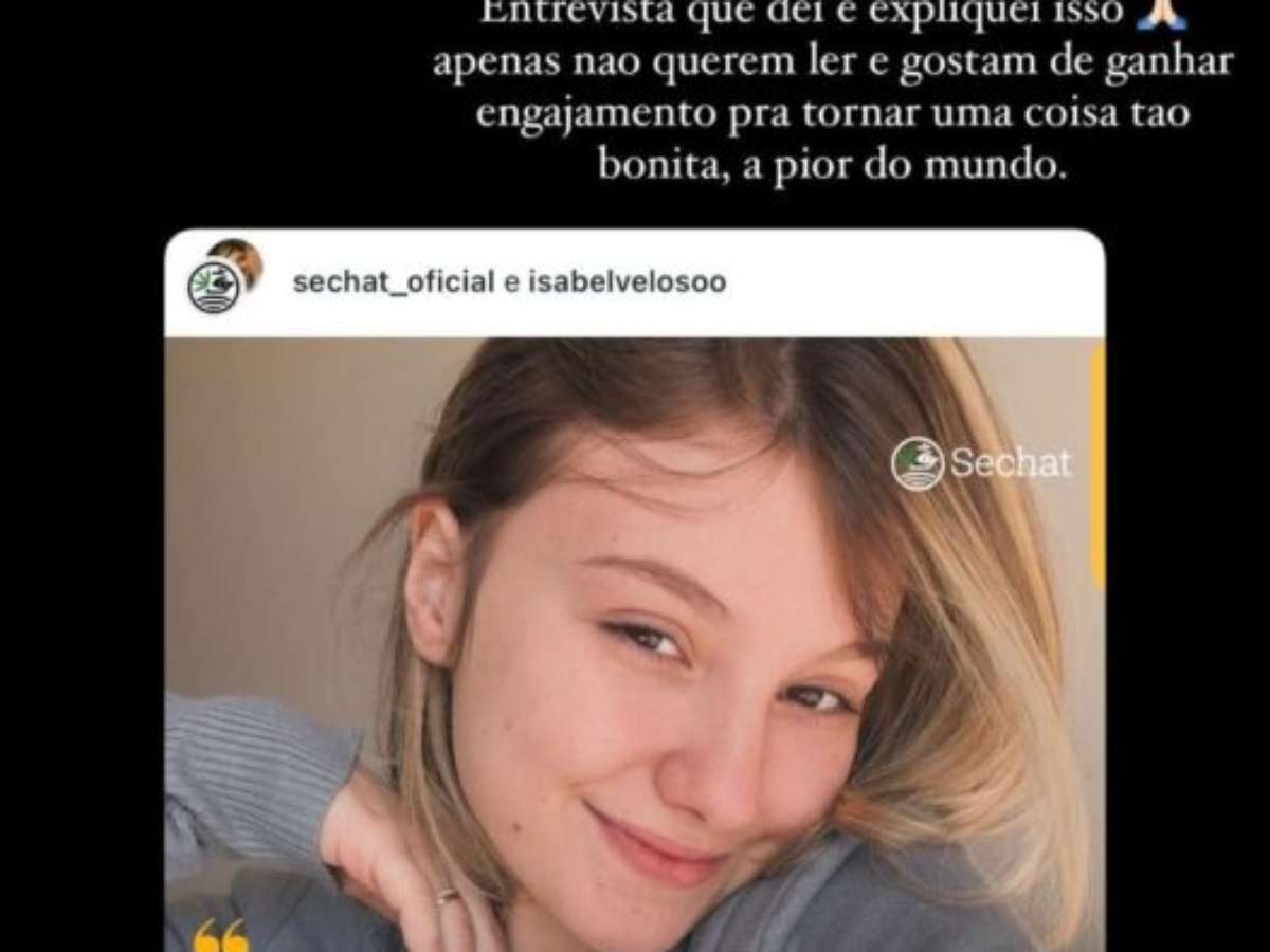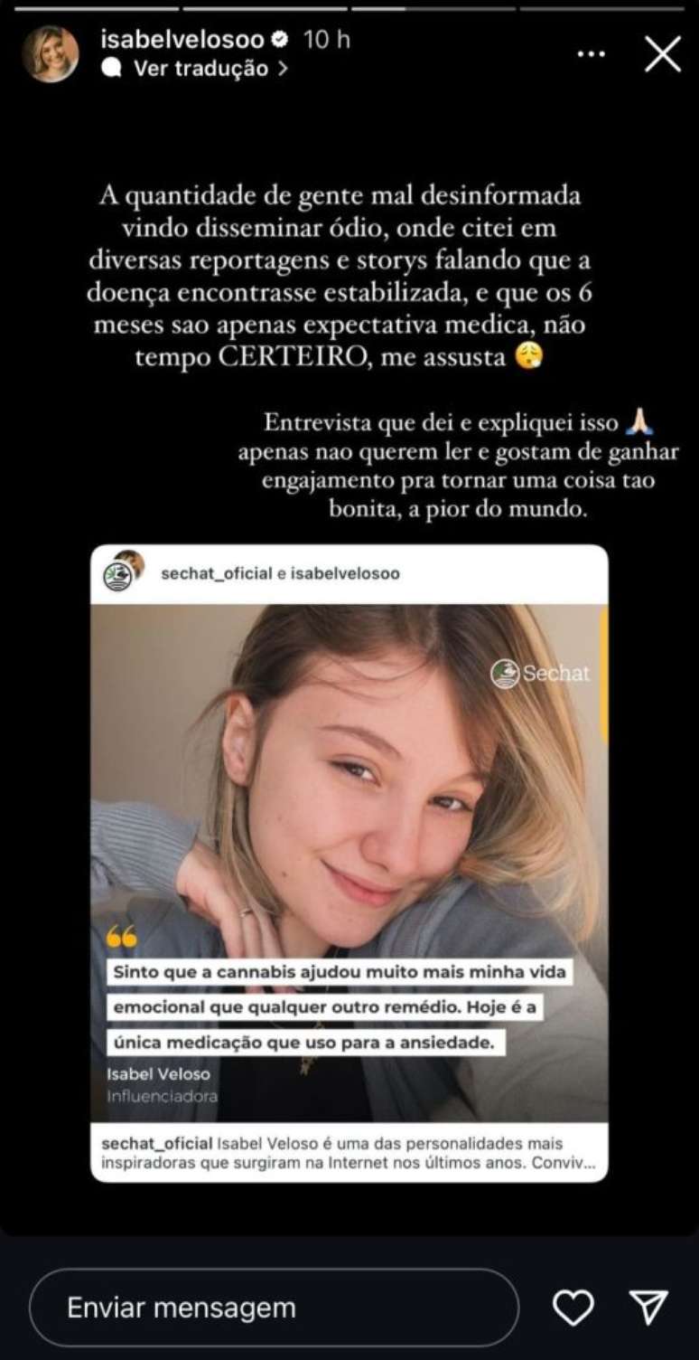 "A quantidade de gente mal informada vindo a disseminar ódio, onde citei em diversas reportagens e storys falando que a doença encontra-se estabilizada e que os 6 meses são apenas expectativa médica, não tempo CERTEIRO, me assusta", disse Isabel.