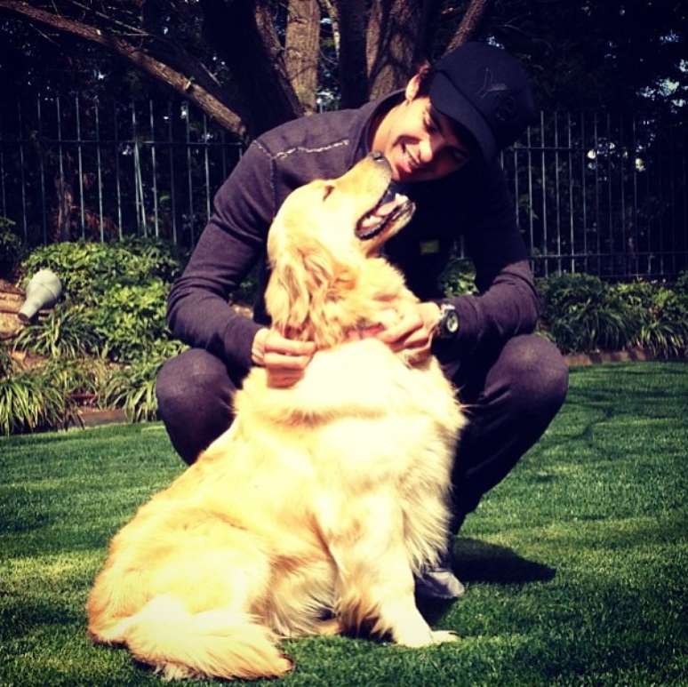 Na imagem, o meio-campista faz carinho no animal, um Golden Retriever. Kaká é casado com Carol Celico, com quem tem dois filhos, Luca, 4 anos, e Isabella, que completa 2 anos na próxima semana. A família vive em Madrid, na Espanha.