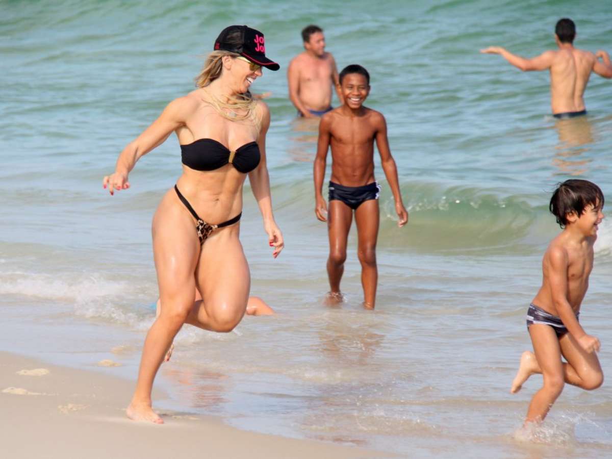 Andrea Andrade e o filho Rinaldo, 7 anos, aproveitaram o calor do Rio de Janeiro, neste domingo (1), para brincar na praia da Barra da Tijuca. A modelo e musa do Carnaval chamou atenção com seu micro biquíni de oncinha