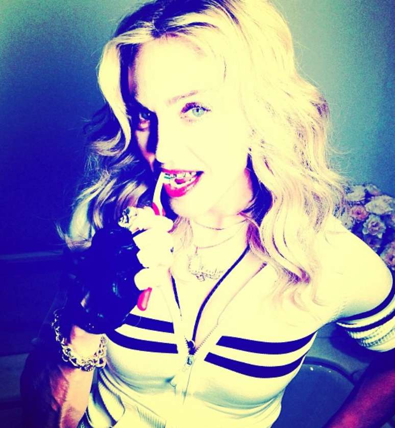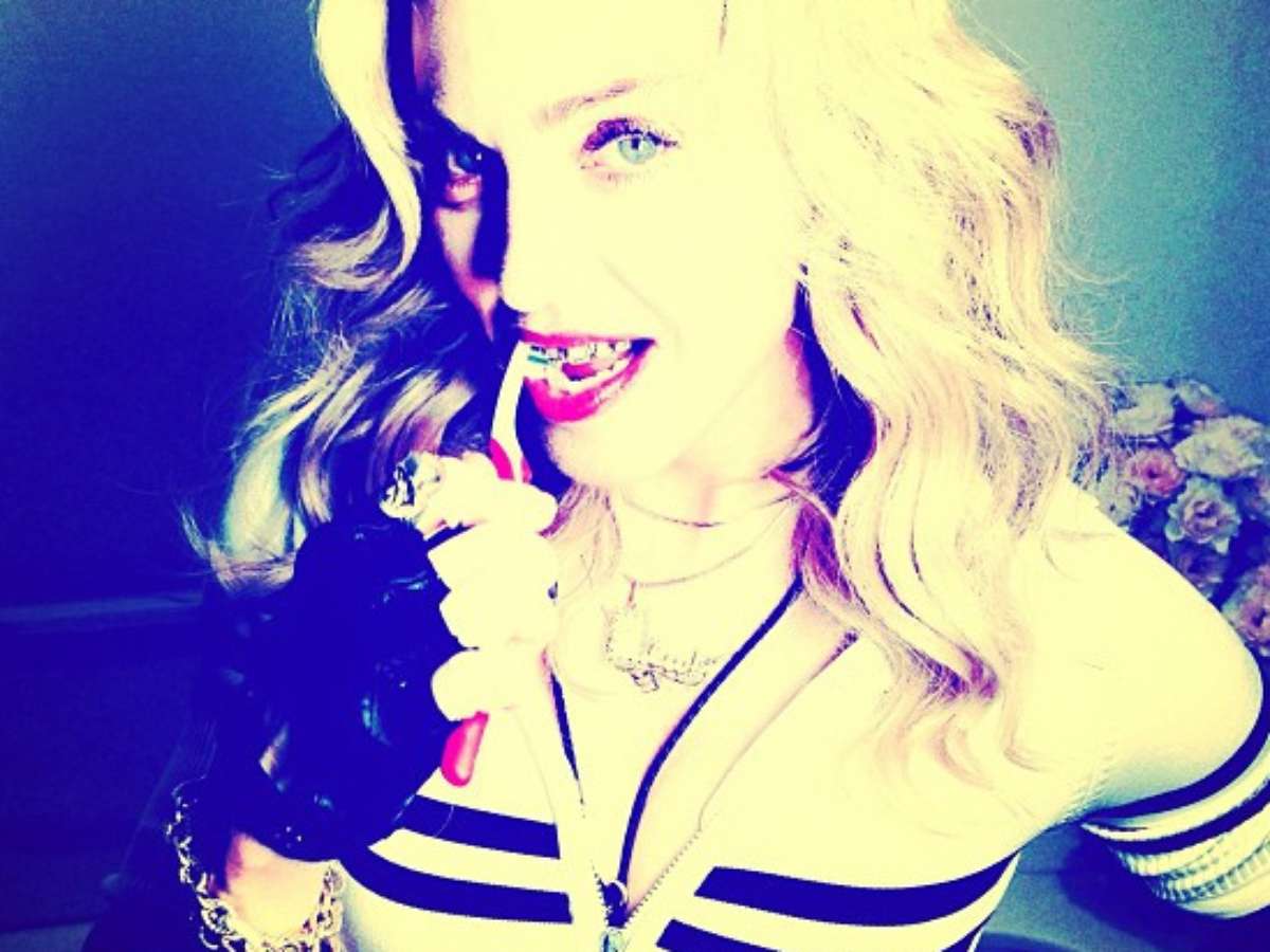 Madonna postou em suas redes sociais, nesta sexta-feira (26), uma foto em um momento íntimo. A cantora estava escovando os dentes e seu grilzz, um tipo de aparelho ou dentadura feito com joia. O modelo da estrela é de ouro e diamantes.