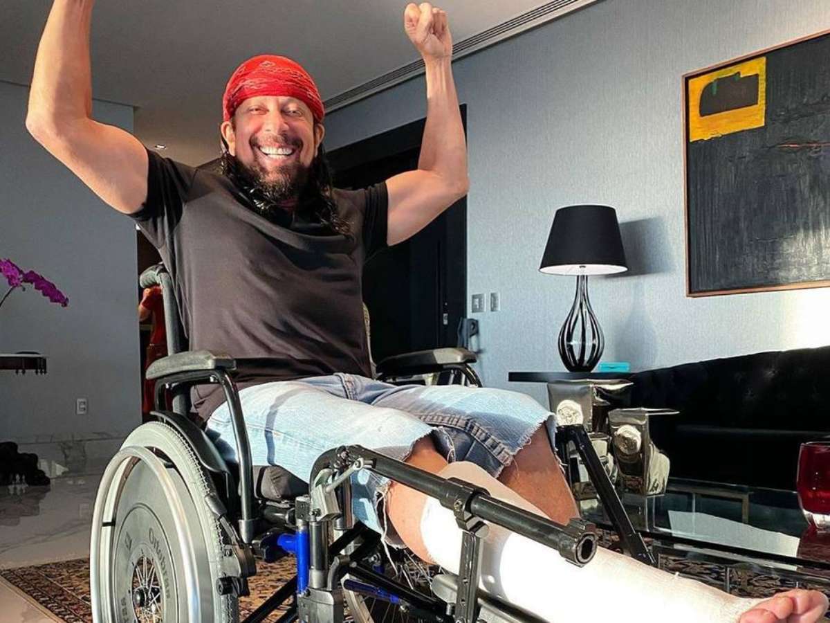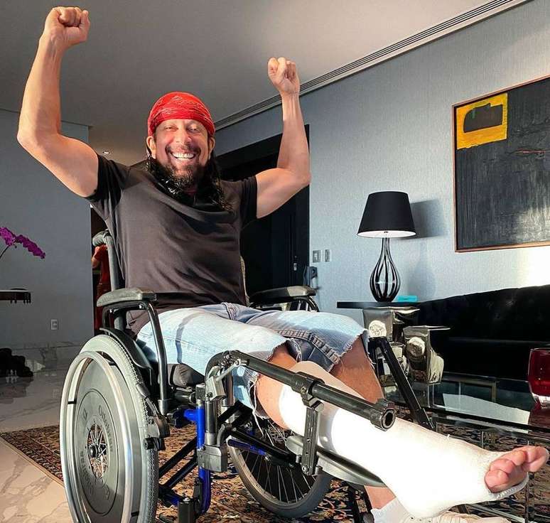 O artista publicou uma foto na rede social em que aparece sentado em uma cadeira de rodas e com o pé engessado. A expressão dele, porém, é de alegria e ele vibra, como se estivesse comemorando. "Desanimar não combina comigo", escreveu na legenda.