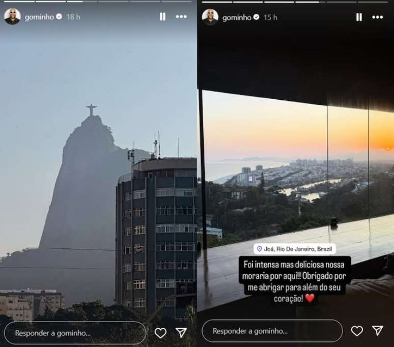 No story, Gominho escreveu: "Foi intensa, mas deliciosa nossa morada por aqui!! Obrigado por me abrigar para além do seu coração."