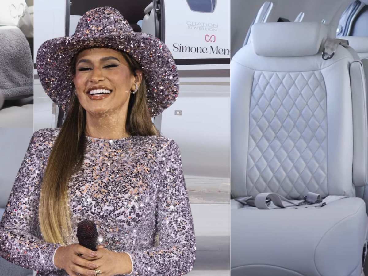 Após retrofit, cabine do jatinho de Simone Mendes ganhou configuração sofisticada com poltronas frente a frente e espaço otimizado. Veja os detalhes!