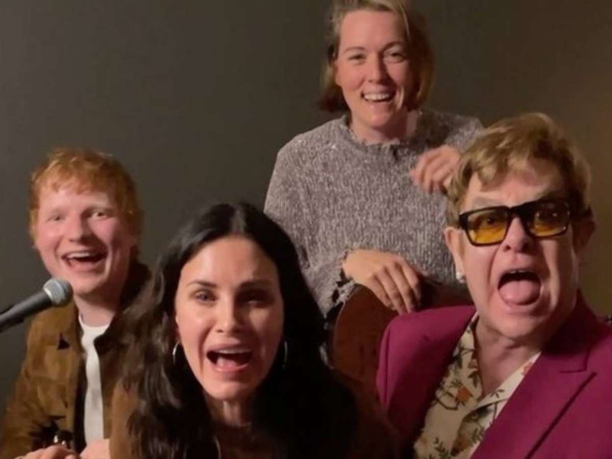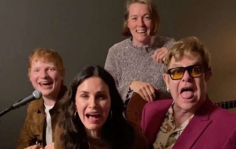 Courteney Cox e Ed Sheeran fizeram um vídeo juntos cantando ao lado de Elton John e a compositora Brandi Carlile. O post foi compartilhado neste domingo, 6, nas redes sociais de Ed e da intérprete da personagem Monica, de Friends.