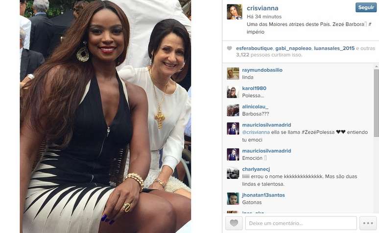 "Uma das Maiores atrizes deste País. Zezé Barbora #império", escreveu na legenda. Notando o engano, os seguidores de Cris Vianna brincaram com o erro.