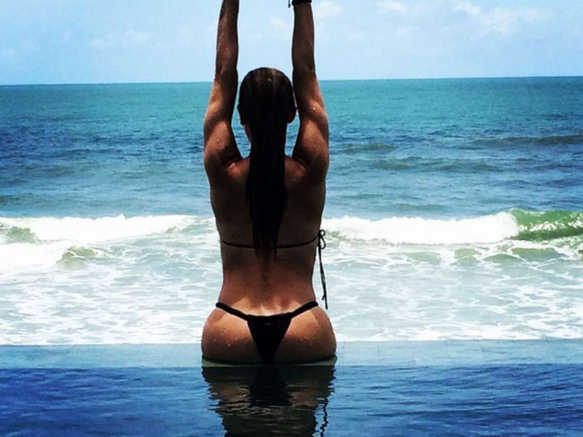 Danielle Winits mostrou mais uma vez que está com tudo em cima, principalmente de costas, no Instagram nesta quarta-feira (12). De biquíni, a atriz posou para uma foto dentro de uma piscina em frente ao mar, se alongando e deixando parte do bumbum de fora da água.