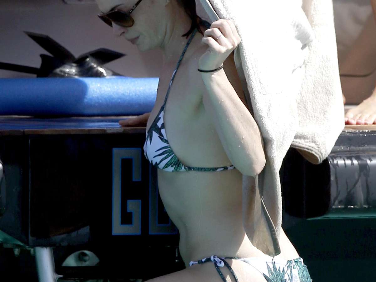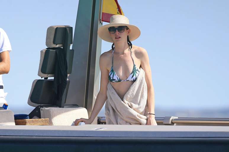 Anne Hathaway foi clicada na tarde dessa quarta-feira (12) se divertindo com o marido, Adam Shulman, em um iate na ilha de Formentera, na Espanha. Em um cenário paradisíaco, a atriz exibiu boa forma ao usar um biquíni estampado.