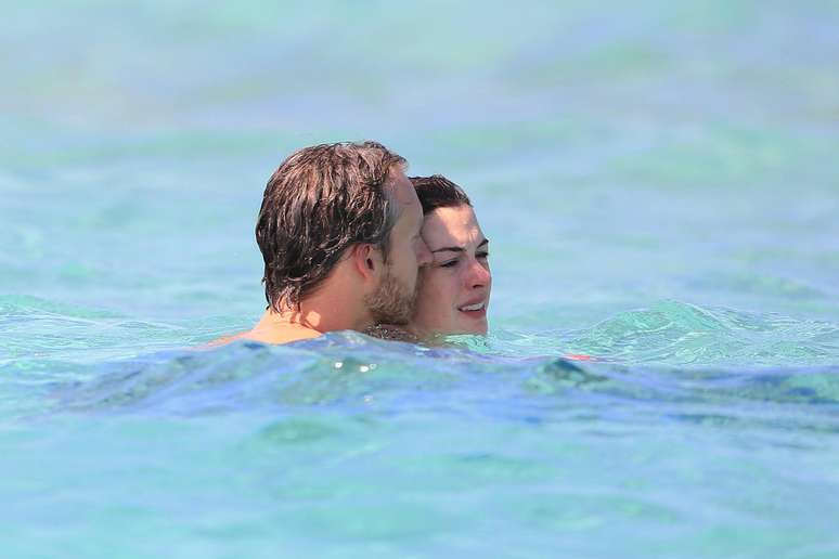 A estrela de Os Miseráveis se refrescou no mar com o amado, e não dispensou o uso de óculos escuros e chapéu para se proteger do sol. Anne e Adam oficializaram a união em 2012.
